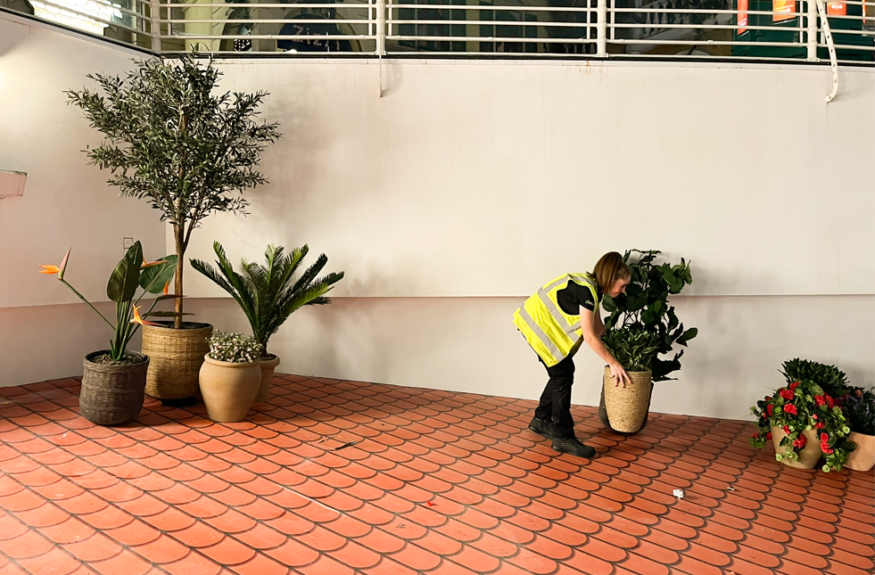 Smaller arrangements using plants such as artificial ferns allowed us to layer different heights and pot sizes, giving the installation depth and a natural look. We were also able to attach these smaller plants to the overlooking balustrades.