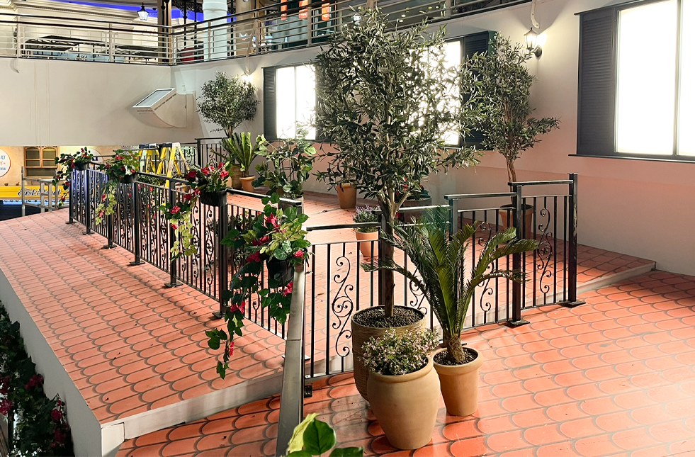 To continue the Mediterranean theme, we dressed two cascading balconies that were added as part of the redesign. The client wanted them to feel like Mediterranean terraces, so we used a mixture of artificial olive and palm trees in varying sizes from 2.1m to 1.8m, positioned in large terracotta containers to visually anchor them within the space.