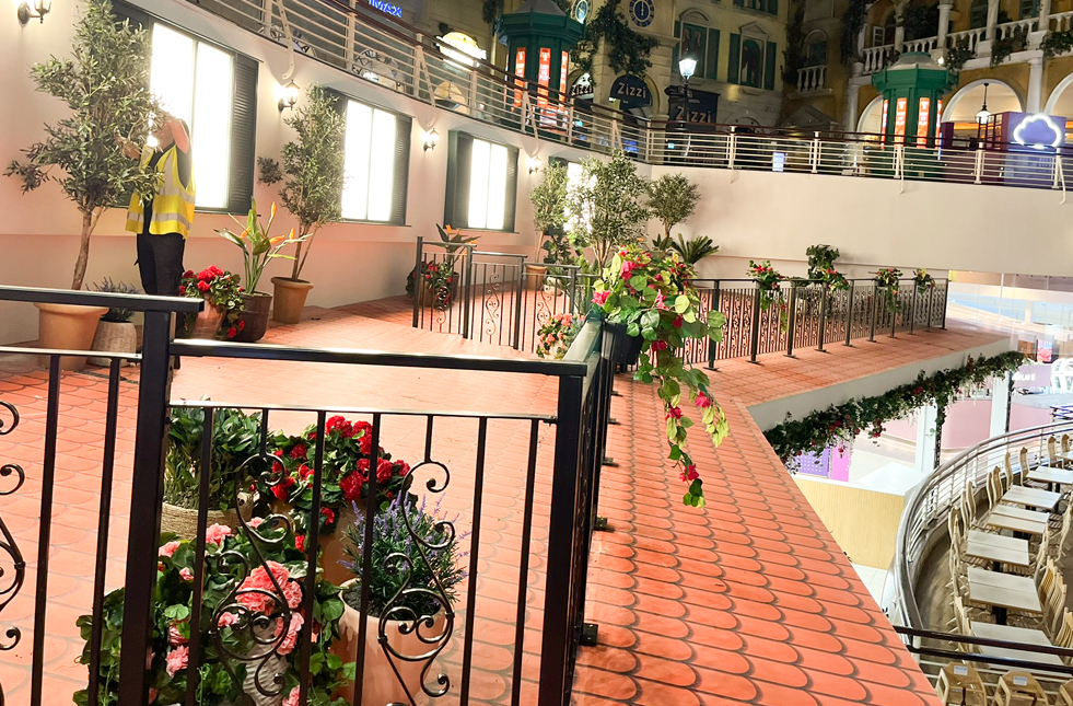 Smaller arrangements using plants such as artificial ferns allowed us to layer different heights and pot sizes, giving the installation depth and a natural look. We were also able to attach these smaller plants to the overlooking balustrades.