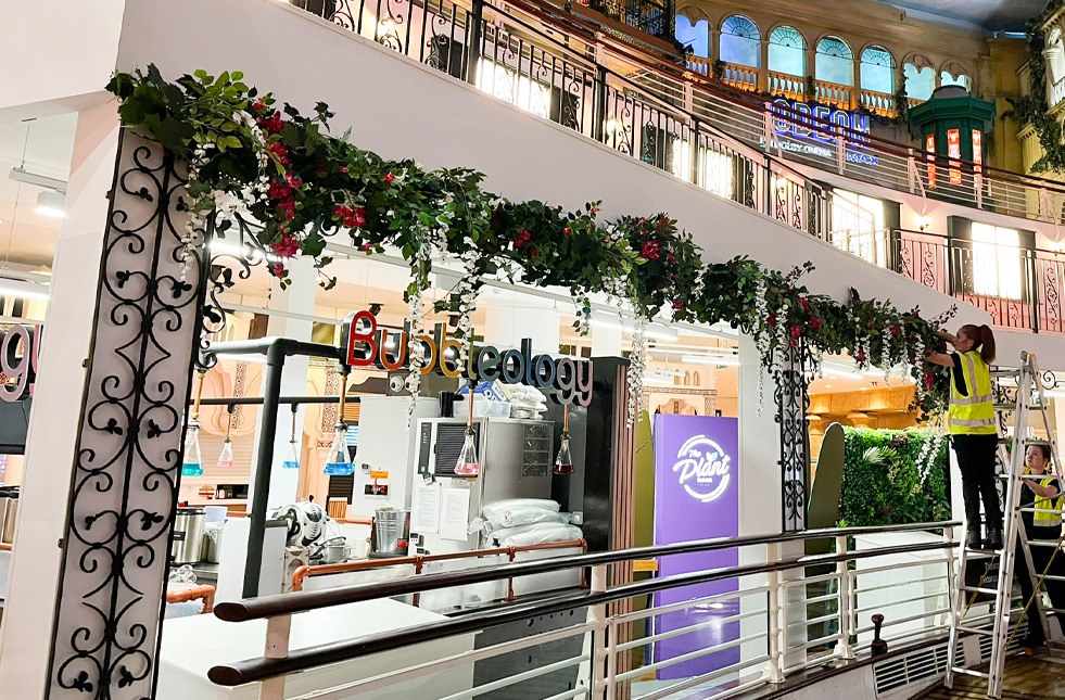 Inleaf helped transform The Orient, a central space in The Trafford Centre food court to bring the client’s Mediterranean-inspired vision to life using a mix of artificial greenery and flowers.